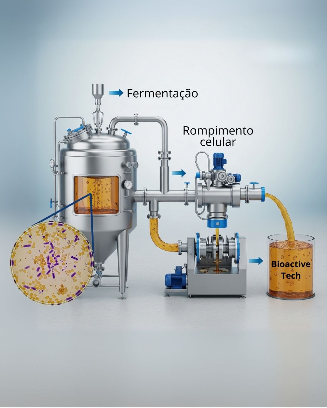 A BIOACTIVE TECH é o resultado do rompimento celular de microorganismos selecionados, através de um processo eficiente e controlado que preserva as características das biomoléculas e compostos nutricionais presentes no meio celular. Durante o processo não há utilização de reagentes químicos e não são utilizadas temperaturas elevadas que podem desnaturar enzimas e degradar os componentes nutricionais.
